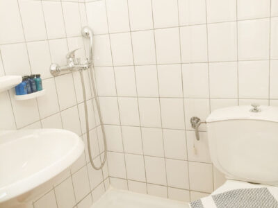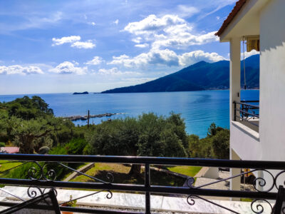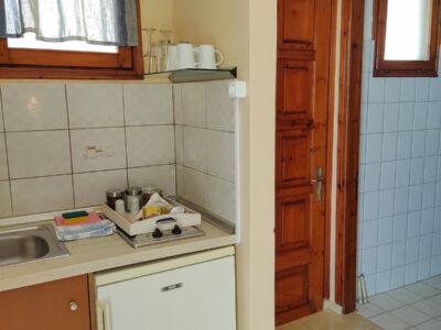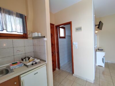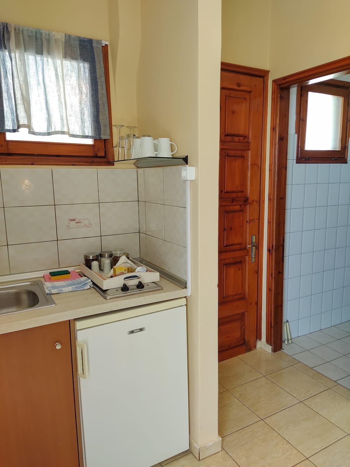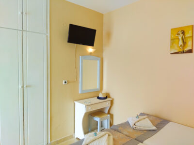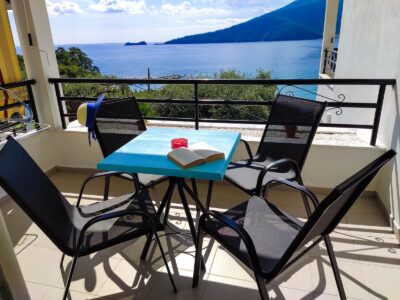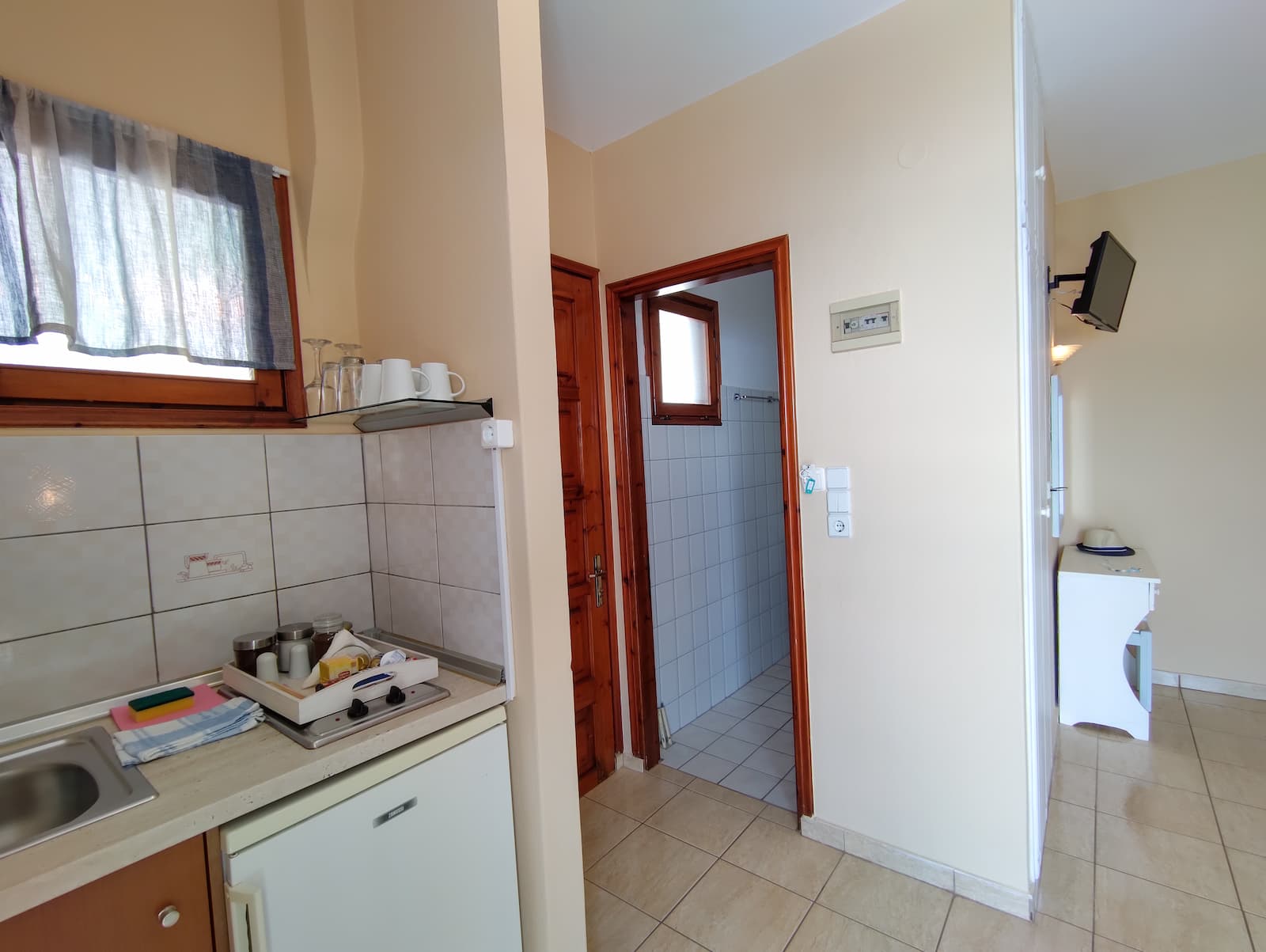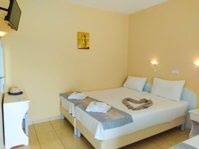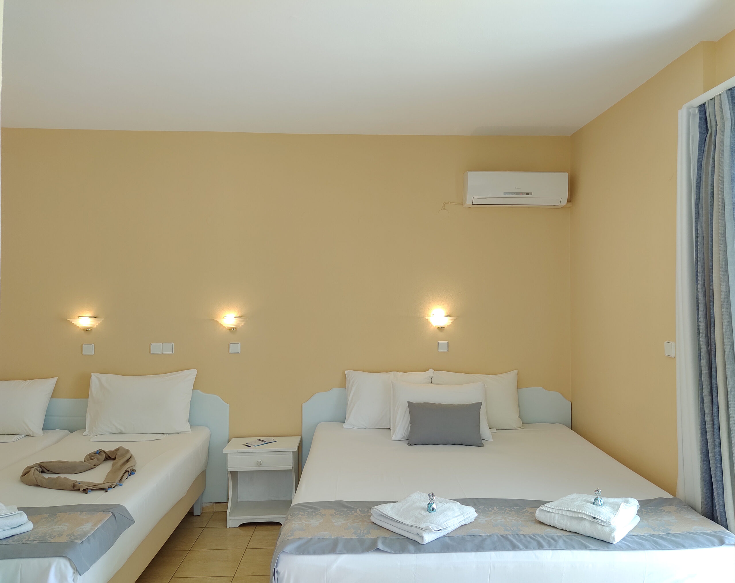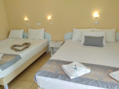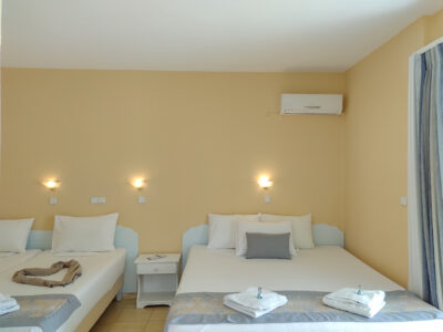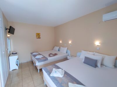 Our Spacious Family Studios with Sea View (ca. 35m2) are located either on the first floor or the ground floor of the property and can accommodate comfortably up to 4 persons, ideally families with 2 children. Our family studios are one-room and equipped with 1 king-size double bed and 2 single beds. They also feature a fully equipped kitchenette as well as a welcome package with coffee, sugar, honey etc. so that we can make your stay with us as comfortable as possible. In our family studios you will also find a bathroom with shower, air-condition, TV, wi-fi, hairdryer, safe box, slippers and all the necessary bathroom amenities. Last but certainly not least, our studios have large balconies with full sea view, overlooking Golden Beach as well as the entire greenery of the area.
